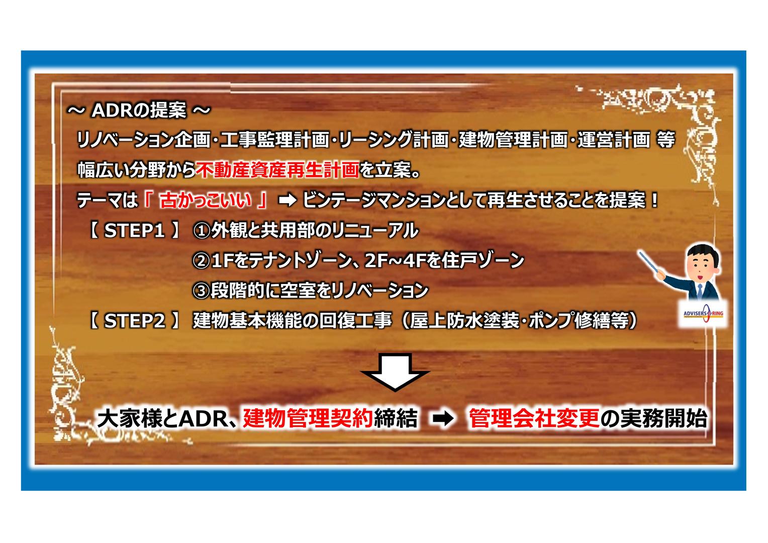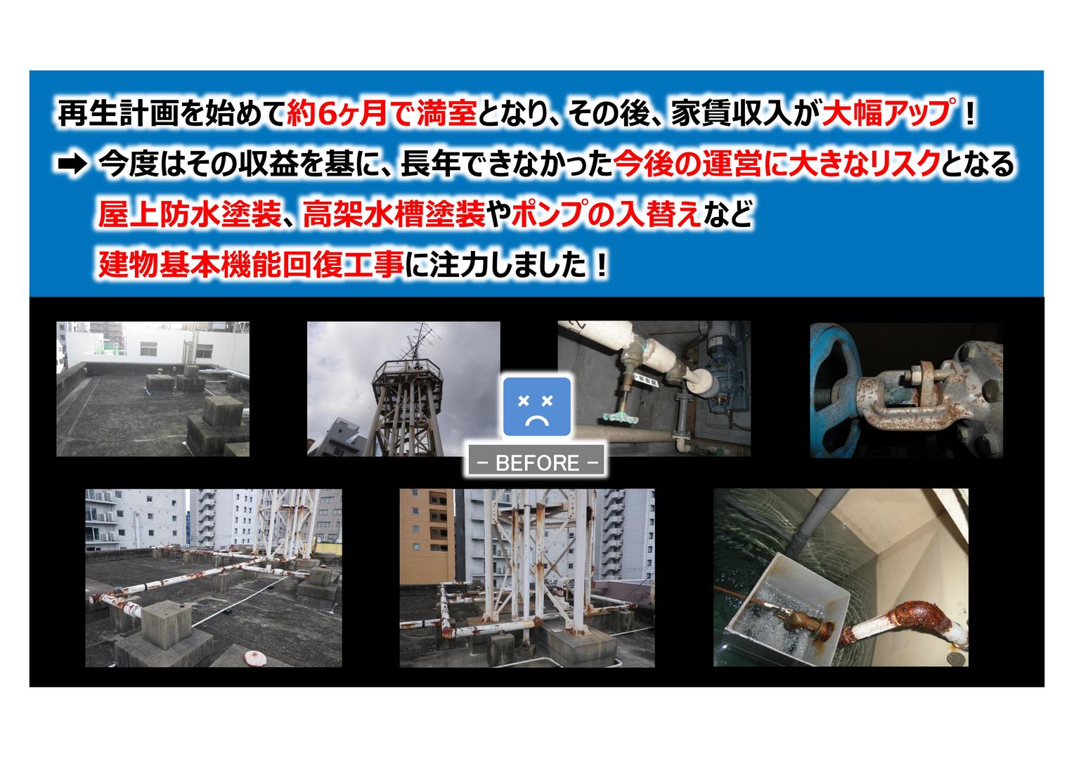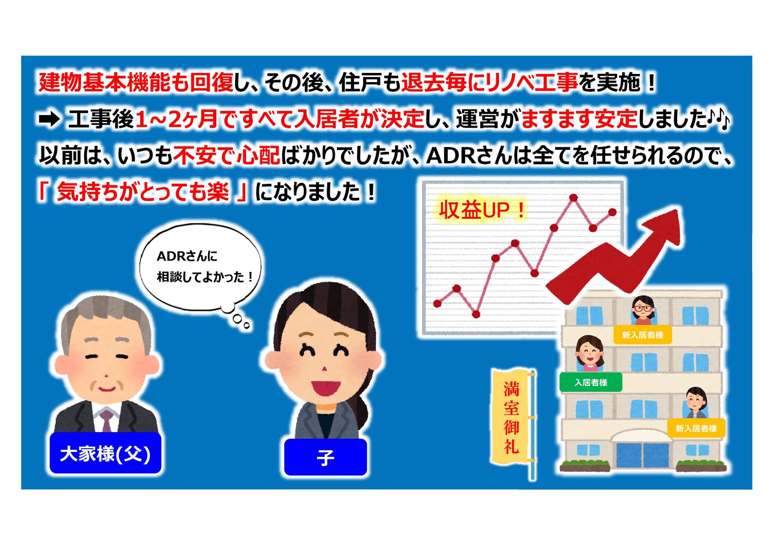「 都心近くの築27年鉄筋コンクリート造賃貸物件(住戸×18戸) 好立地なのに入居が決まりにくい・・・ どうしたらいいか・・・? 」 02 収益物件 12 集合住宅 31 コンサルティング 41 外部再生工事 42 リノベーション 51 建物管理 〈お悩み〉 父所有の築27年鉄筋コンクリート造賃貸物件(住戸×18戸) 都心まで徒歩圏内で立地はすごく良いのに空室が多く、 入居もなかなか決まらない・・・ 管理会社に相談しても、 抜本的な運営改善になかなか繋がらない・・・ どうしたらいいか・・・?
