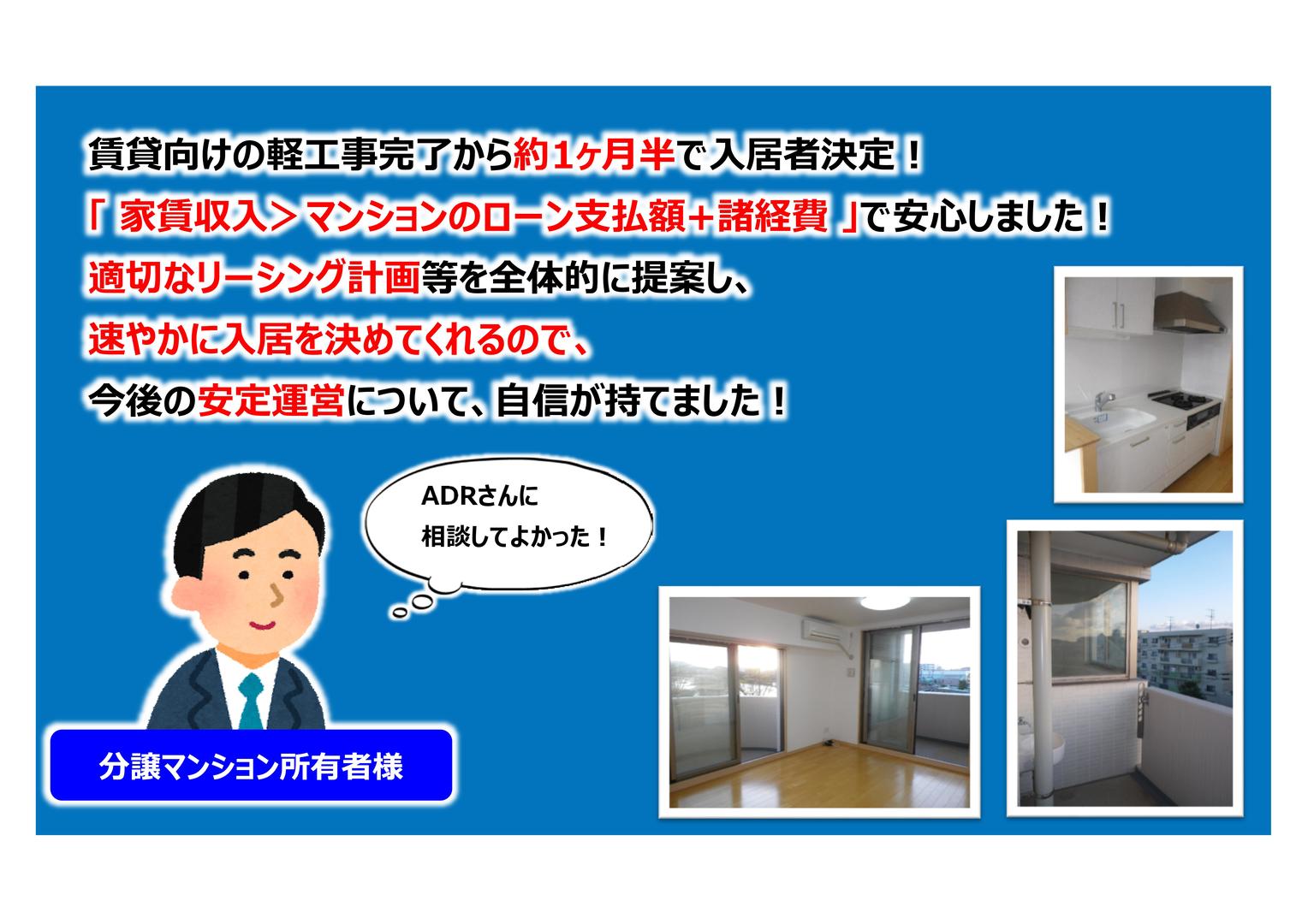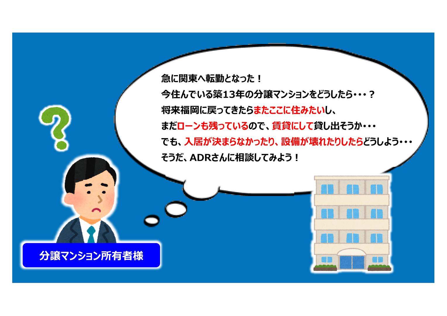 「 急な関東への転勤!今の自宅(分譲マンション、1SLDK)を手放さずに残債を減らすには・・・? 」 02 収益物件 11 分譲マンション 31 コンサルティング 35 賃貸仲介 42 リノベーション 51 建物管理 〈お悩み〉 ADR仲介で購入した分譲マンション(1SLDK)に住んでいるが、 急に関東へ転勤となった! 将来もここに住みたいし、ローンも残っているので、 賃貸にして貸し出す方がいいか・・・? でも、入居が決まらなかったらどうしよう・・・