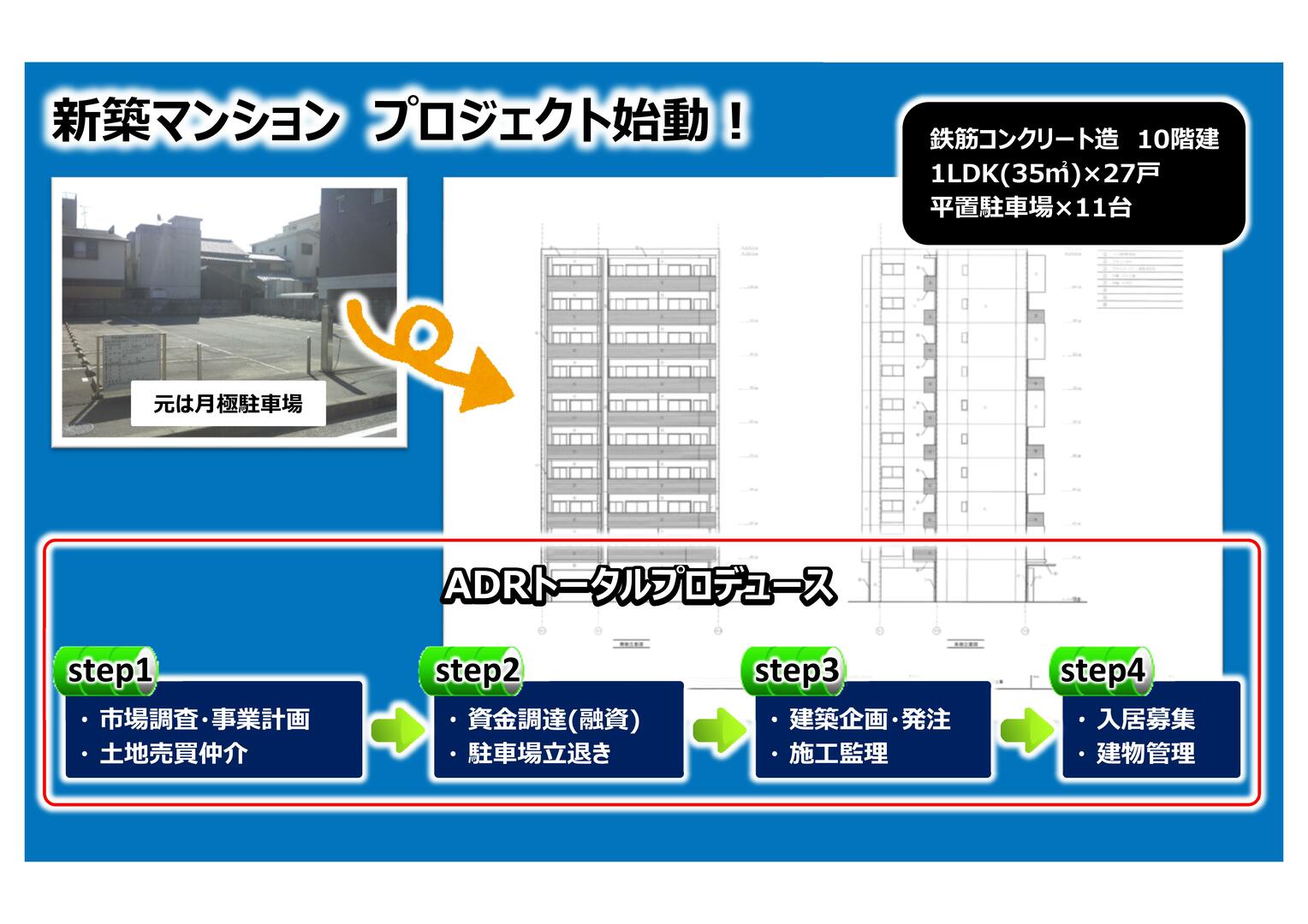 マンション一棟(1LDK×27戸、平置駐車場×11台)を新築し、